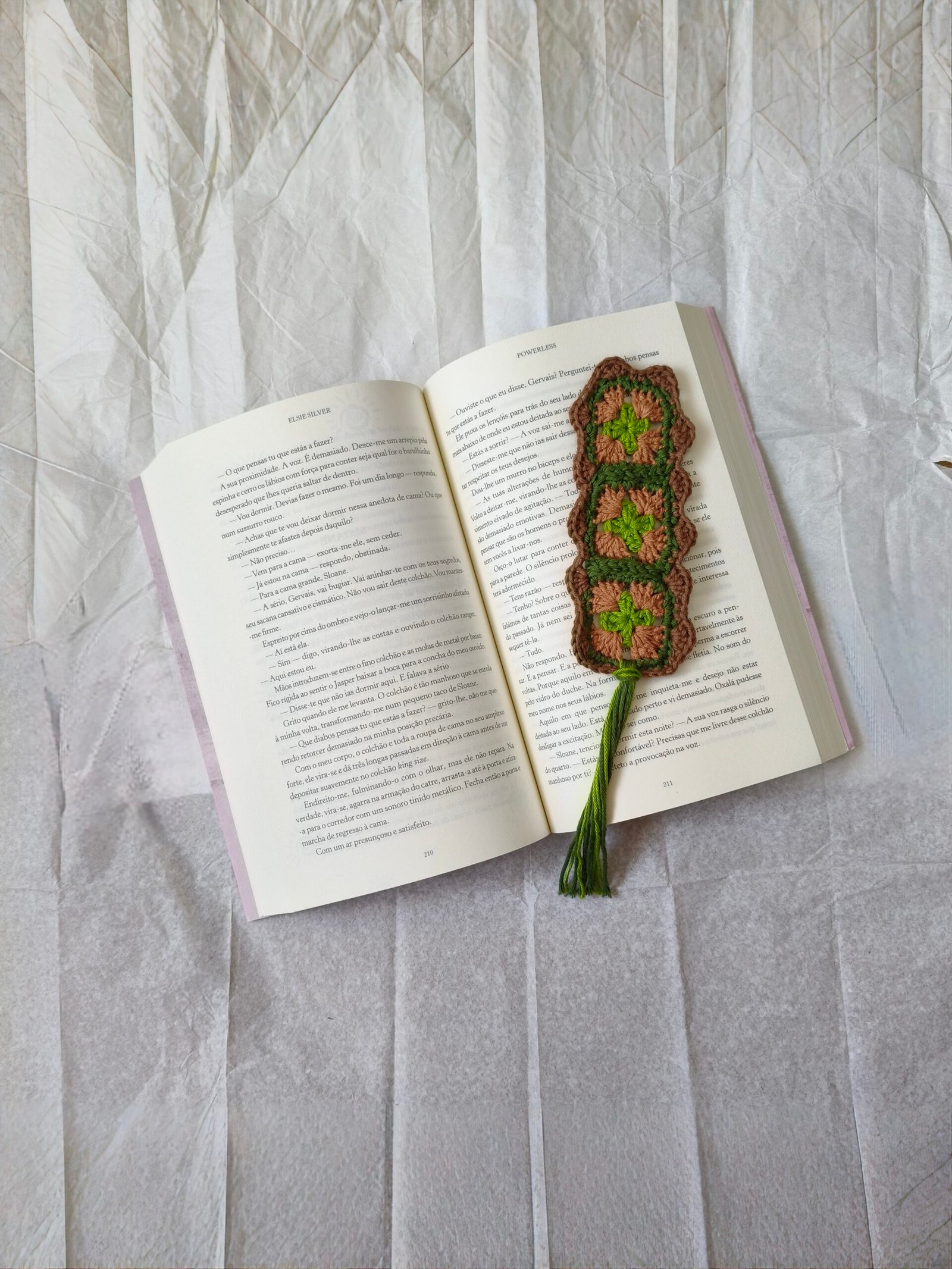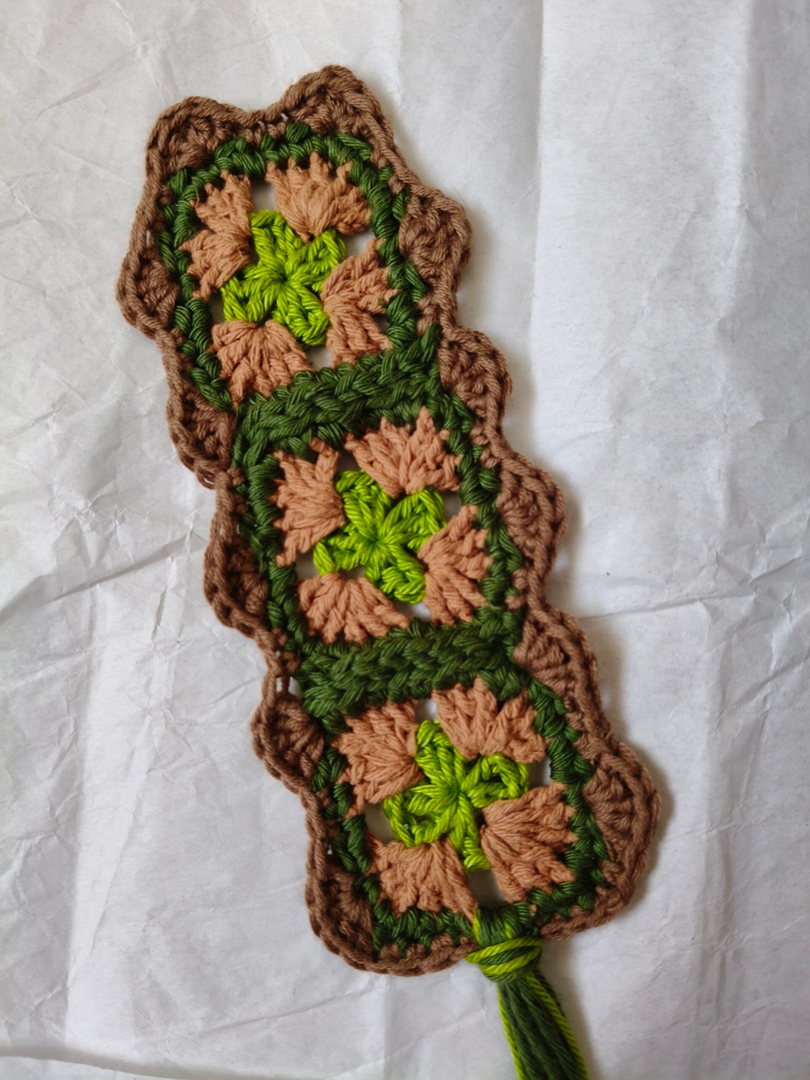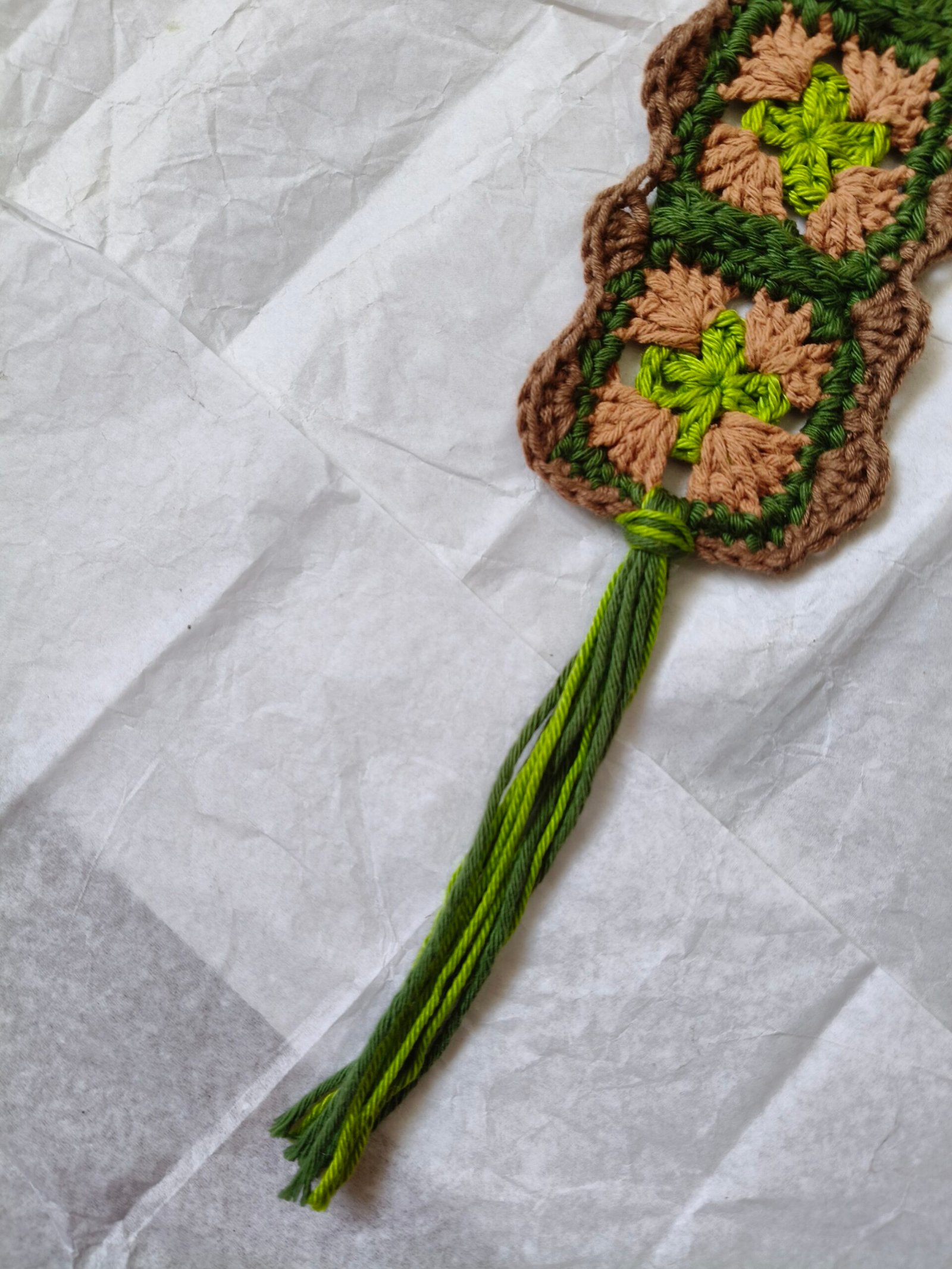 Marcador de livro com quadradinhos da avó (os famosos granny squares).
